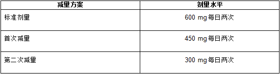 剂量调整:如治疗过程中出现不良事件,可能需要暂时中断给药、降低剂量或者停止本品治疗。应根据患者耐受性,以每次减量150 mg的方式逐步降低本品的剂量。如果患者不能耐受300 mg每日两次的给药剂量,应该永久停止本品治疗。