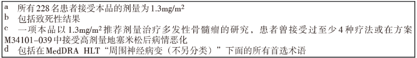 在三项临床研究中评价了本品在推荐剂量1.3mg/㎡下的疗效和安全性,包括一项随机的地塞米松对照III期试验(M34101-039),治疗669例经1-3线治疗后复发或难治性多发性骨髓瘤患者;一项单臂、开放性、多中心的II期试验,治疗202例至少曾接受过2种治疗且近期发现肌病进展的患者(M34100-025);一项评价本品剂量-效应的II期临床试验,对复发性多发性骨髓瘤患者使用本品1.0mg/㎡或1.3mg/㎡治疗(M34100-024),这些患者曾在一线治疗过程中或过后发生疾病进展或复发。